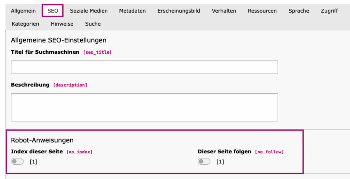 Zusätzlich Seite nicht indexieren und suchbar einstellen