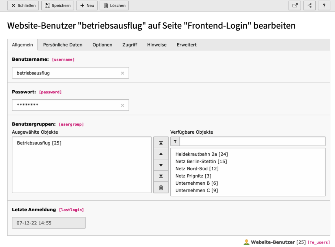 - Benutzergruppen: erstellte Benutzergruppe, hier 'Betriebsausflug' auswählen